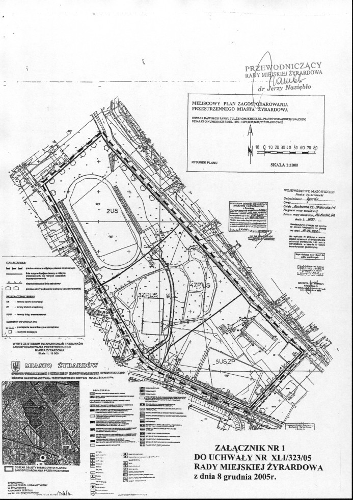 Uchwała Rady Miasta Żyrardowa Nr XLI/323/05 z dnia 8 grudnia 2005r. Plan miejscowy zagospodarowania przestrzennego miasta Żyrardowa obszaru Dawnego Parku (ul. Żeromskiego, ul. Piastowska) obejmującego działki o nr ewid. 1606, 1607, 1608, 1609)