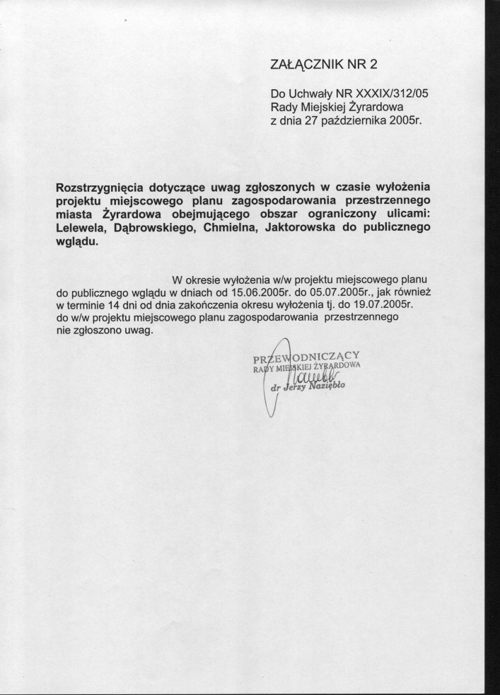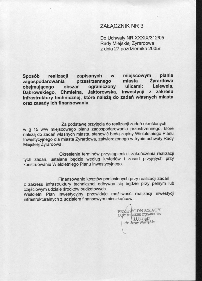 Uchwała Rady Miasta Żyrardowa Nr XXXIX/312/05 z dnia 27 października 2005r. Plan miejscowy zagospodarowania przestrzennego miasta Żyrardowa obszaru ograniczonego ulicami: Lelewela, Dąbrowskiego, Chmielną, Jaktorowską